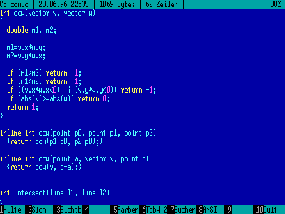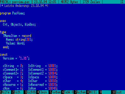 to view those files. Features: adjustable colors, tab-width, ANSI/ASCII conversion, text search, show control characters. Source code available (TurboPascal) |
