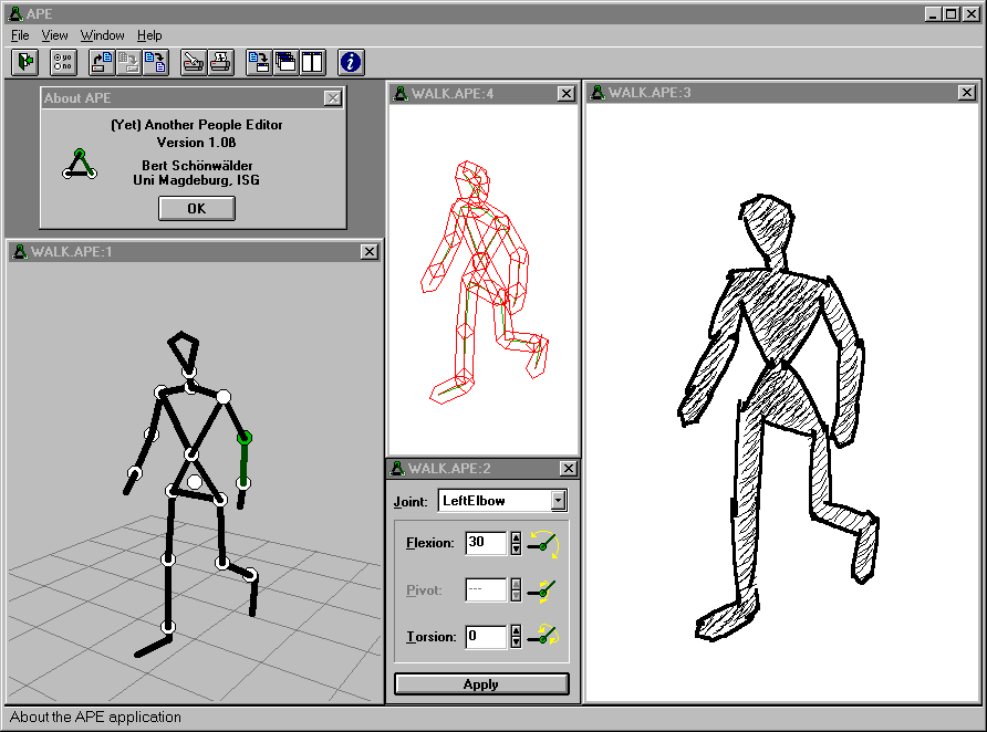 In 1995 I wrote APE, an editor for skeletal models. These skeletons were drawn with some linestyles from our SketchRenderer. The little figures can be used in architectural sketches, for example. | ![]() |